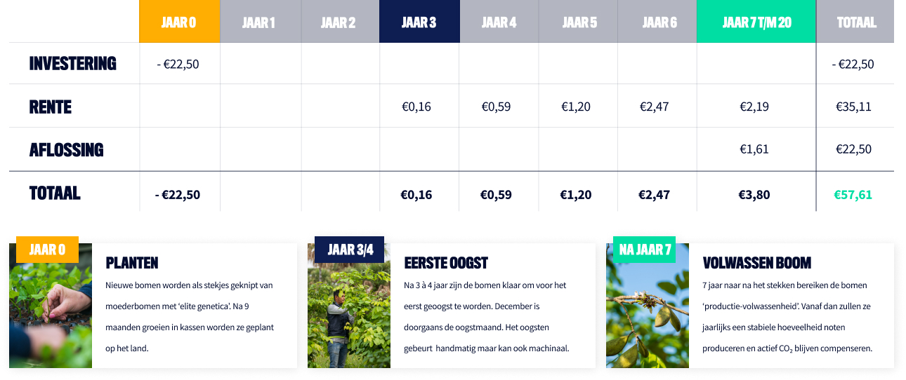 Ieder kwartaal geven wij een order door aan onze herbebossingspartner met hoeveel bomen we bij hen willen planten. Elke boom waarin je investeert is onderdeel van een batch. Batches zijn een paar duizend bomen groot. Alle bomen in de batch worden op hetzelfde moment geoogst en geperst. We kunnen uiteraard niet bijhouden of jouw boom meer of minder noten heeft geproduceerd dan de boom van jouw buurman. Daarom betalen we iedere obligatiehouder proportioneel uit naar het aantal bomen dat je houdt binnen een batch. Dit heeft als voordeel dat de productie en de uitbetaling gemiddeld worden genomen over die paar duizend bomen.